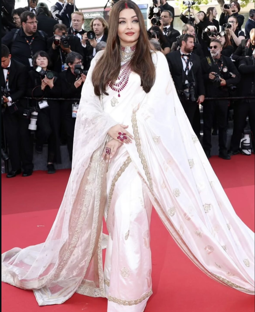 Clad in a handwoven Kadwa ivory Banarasi saree, designed by Manish Malhotra and paired with an opulent handwoven tissue drape, Aishwarya’s look was an ode to Indian grandeur. Her imperial glow was elevated by heirloom rubies from Manish Malhotra Jewellery, each piece echoing regality, legacy, and legend.